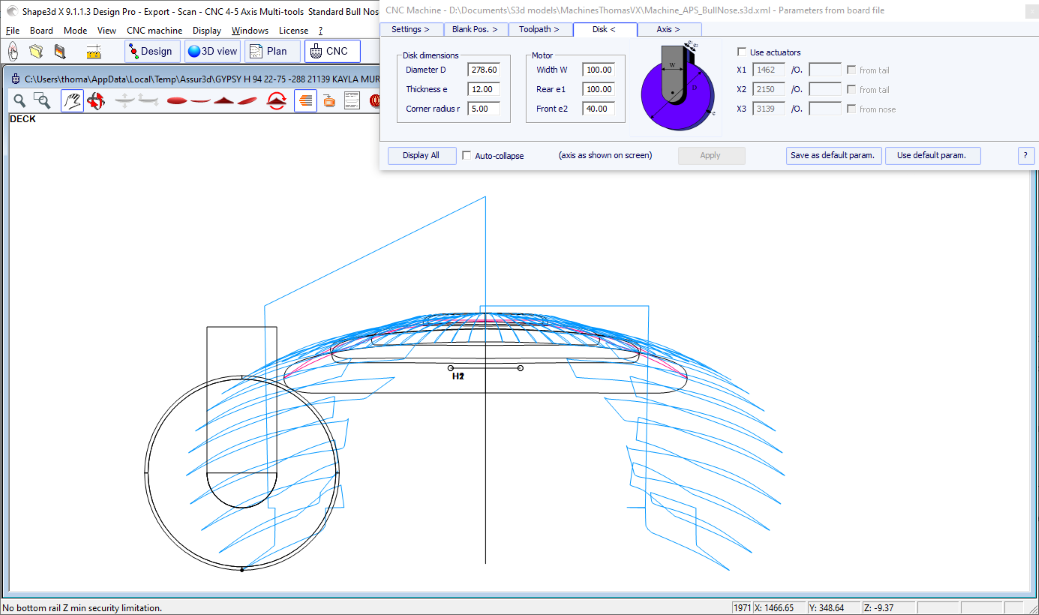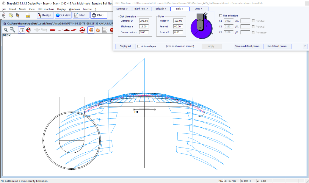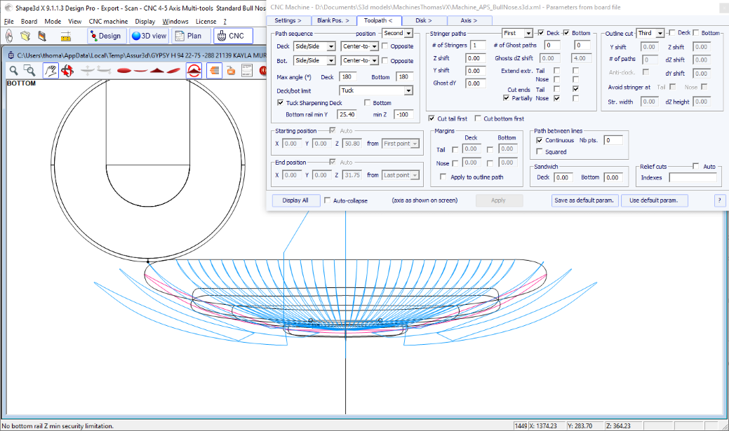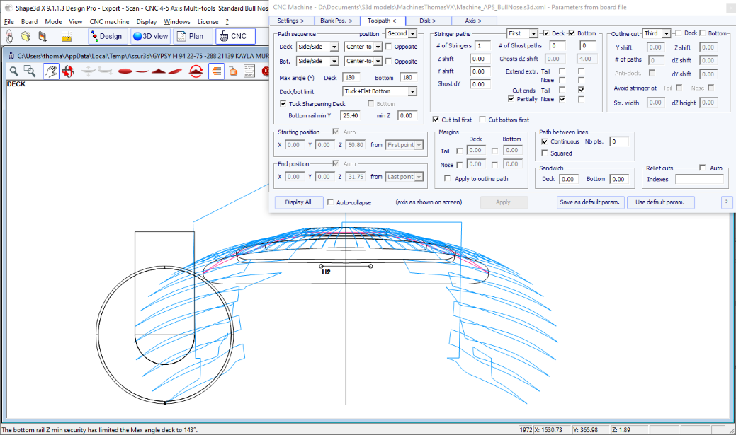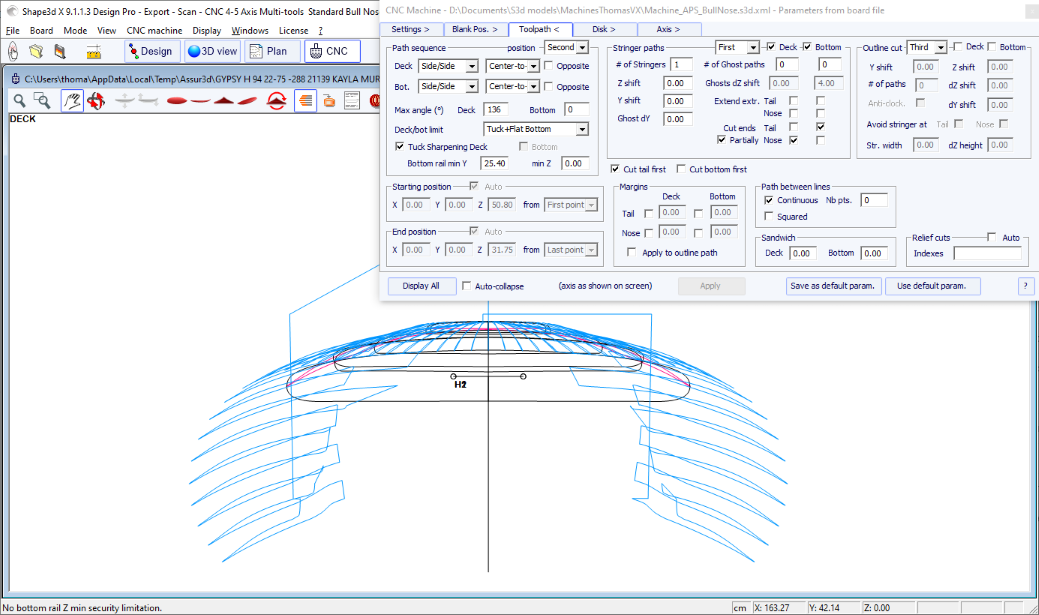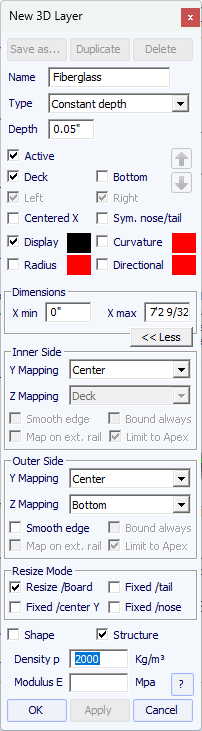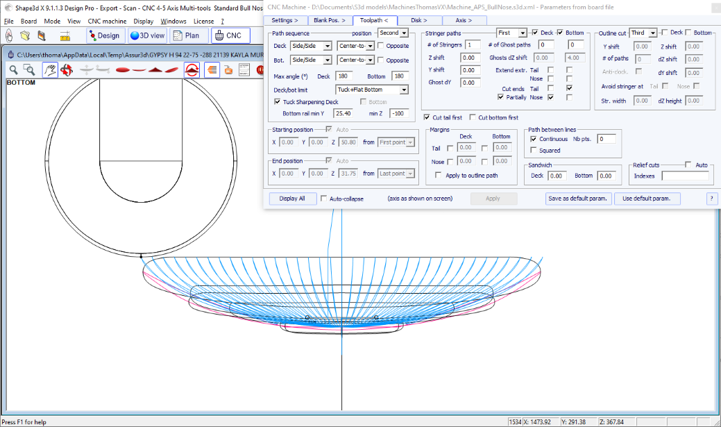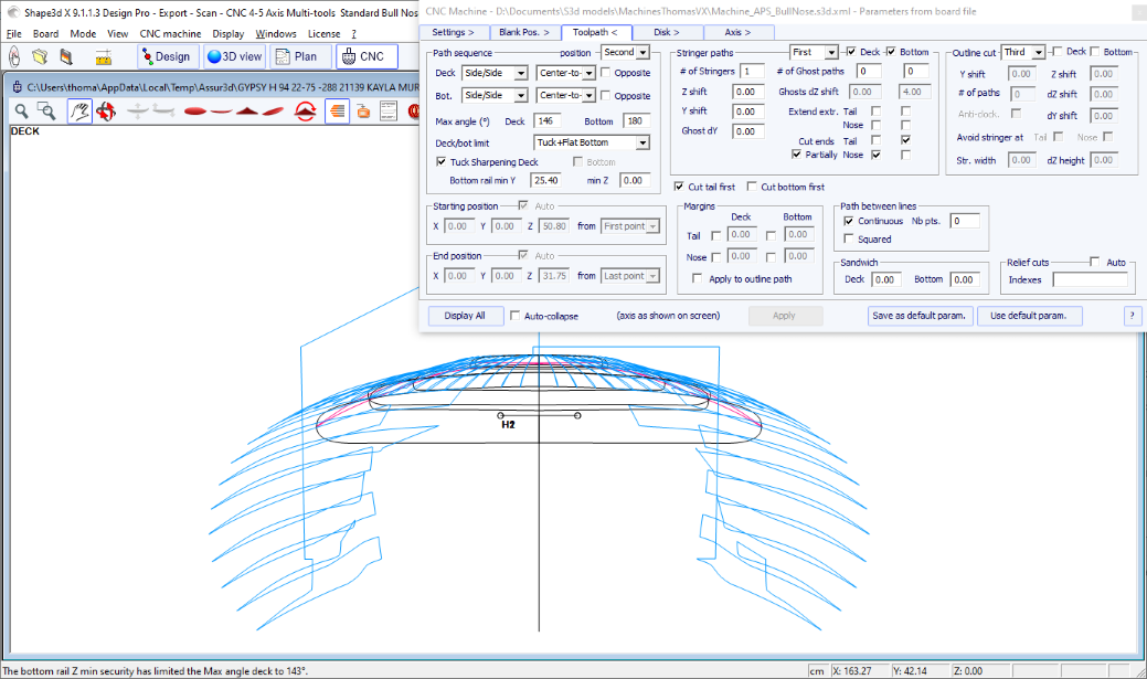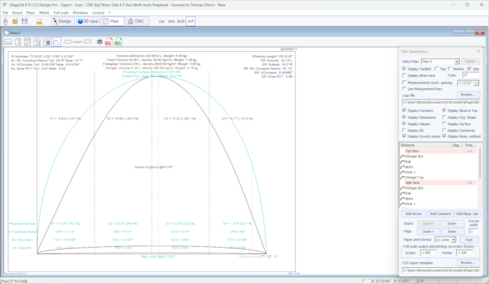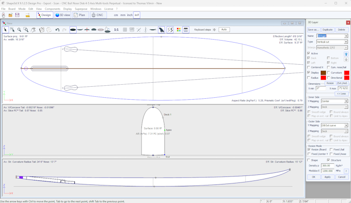 You can visualize the “flow” of the slices maintaining a left click in the outline, profile or thickness view. The width, rocker or thickness appear at the same time, as well as the distance from the tail and from the nose.