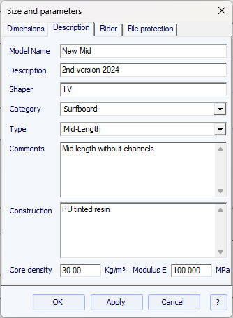 - Enter the name of the model you are going to design, and your name as a shaper. Add any comments you want.